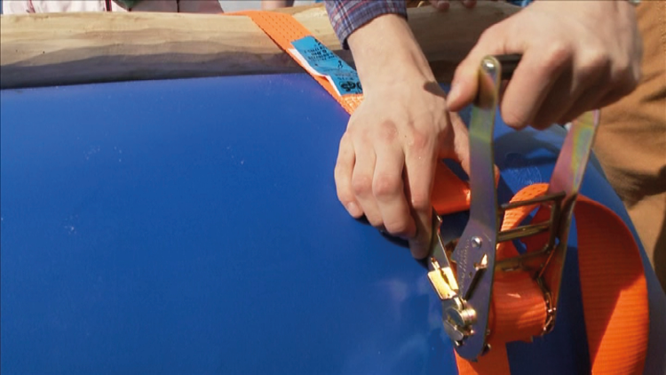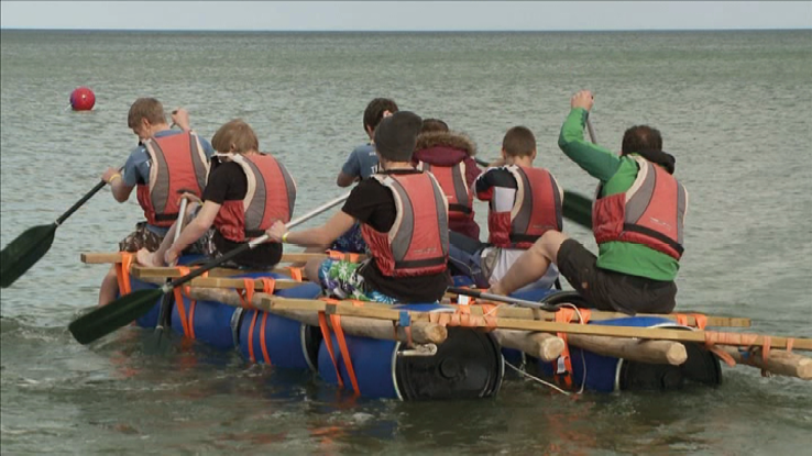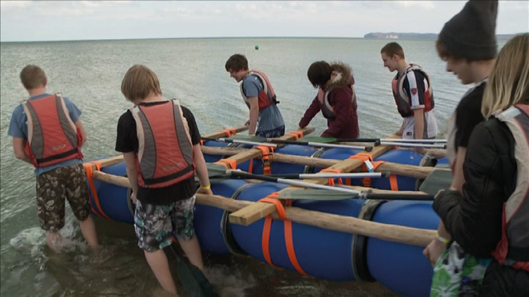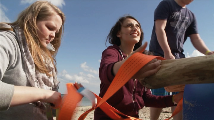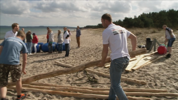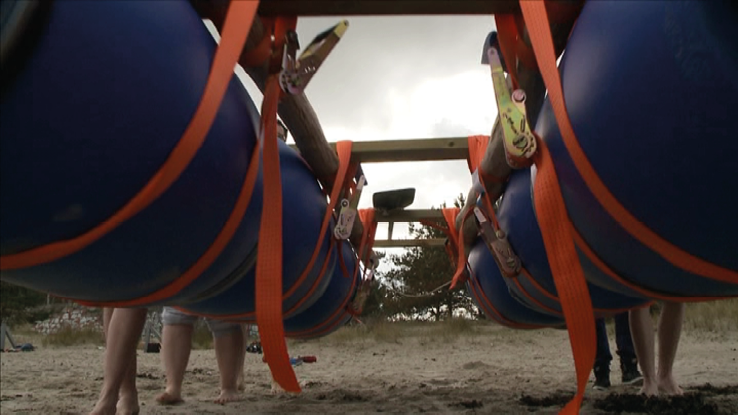 Den Bau eines Floßes aus einfachen Materialien und ohne Werkzeug hat die Gruppe junger Leute erfolgreich abgeschlossen. Nun soll sich zeigen, ob das Ergebnis ihrer gemeinsamen Anstrengungen auch die Bewährungsprobe auf dem Wasser besteht. Wenn alles klappt, wird das Floß die sieben Erbauer sicher auf dem Wasser tragen. Die Zuschauer sehen – aus der Untersicht – den Transport in Richtung Ostsee.