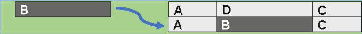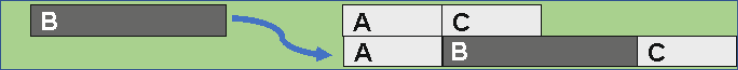 • Insert: Ein Clip oder der Teil eines Clips wird in der Timeline an der Position der Einfügemarke (weiße Linie) eingefügt. Der vorhandene Clip wird getrennt, der neue Clip wird eingefügt. Das Video verlängert sich um die Länge des eingefügten Bereichs.