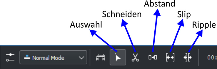 • Schneiden: Trennen von Clips. Der Mauszeiger wird zur Schere. Aufruf auch mit Taste (X).