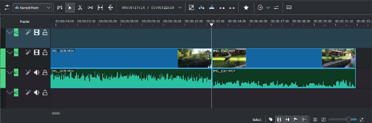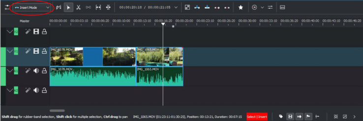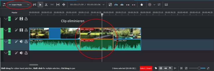 Im Insert Mode schließt das Programm nach dem Löschen des Clips die Lücke automatisch. Sämtliche rechts stehenden Clips dieser Spur rücken nach. Die Länge der Spur verkürzt sich.