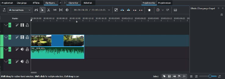 Deinen ersten Clip hast du bereits per Drag&Drop in der Timeline abgelegt. Mit den vorgestellten Werkzeugen kannst du diesen Clip innerhalb der Spur verschieben, auf eine andere Spur verschieben, ihn kürzen und anschließend wieder verlängern. Das geht mit der Maus per Drag&Drop recht gut – selbst bei größeren Videoprojekten.